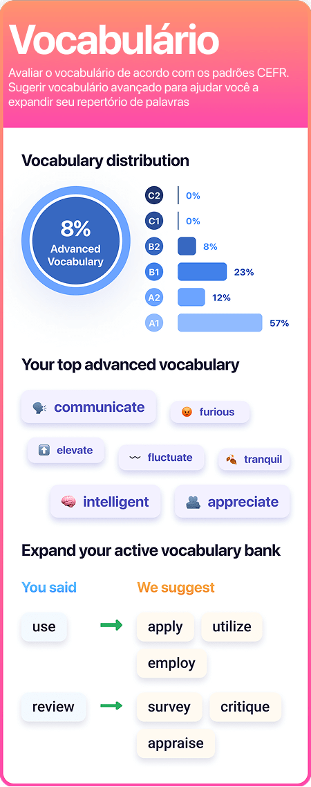 Avaliado pelos padrões nativos, erros apontados e instruções de correção detalhadas e específicas